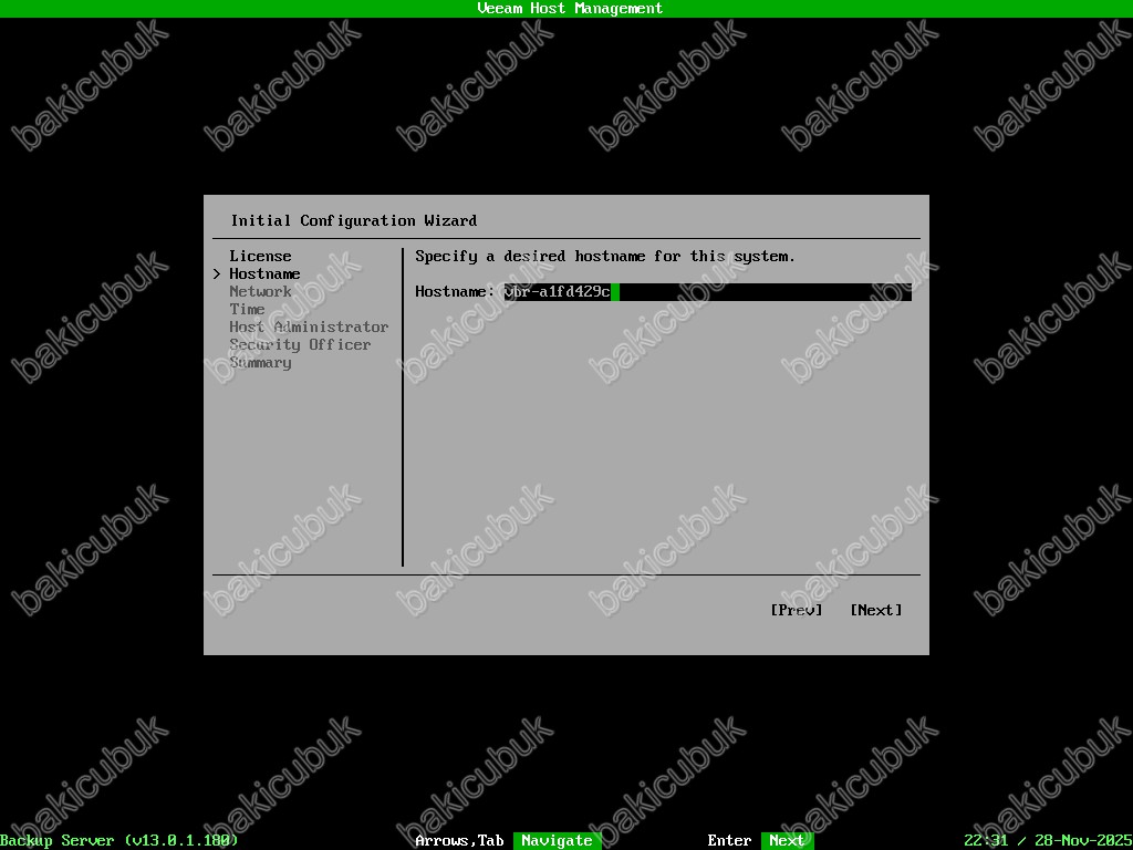 Hostname ekranında Hostname bölümünde Veeam Software Appliance 13.0.1.180 sunucumuz için bir sunucu adı yapılandırıyoruz.