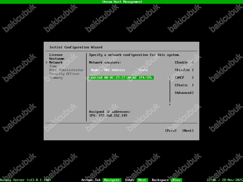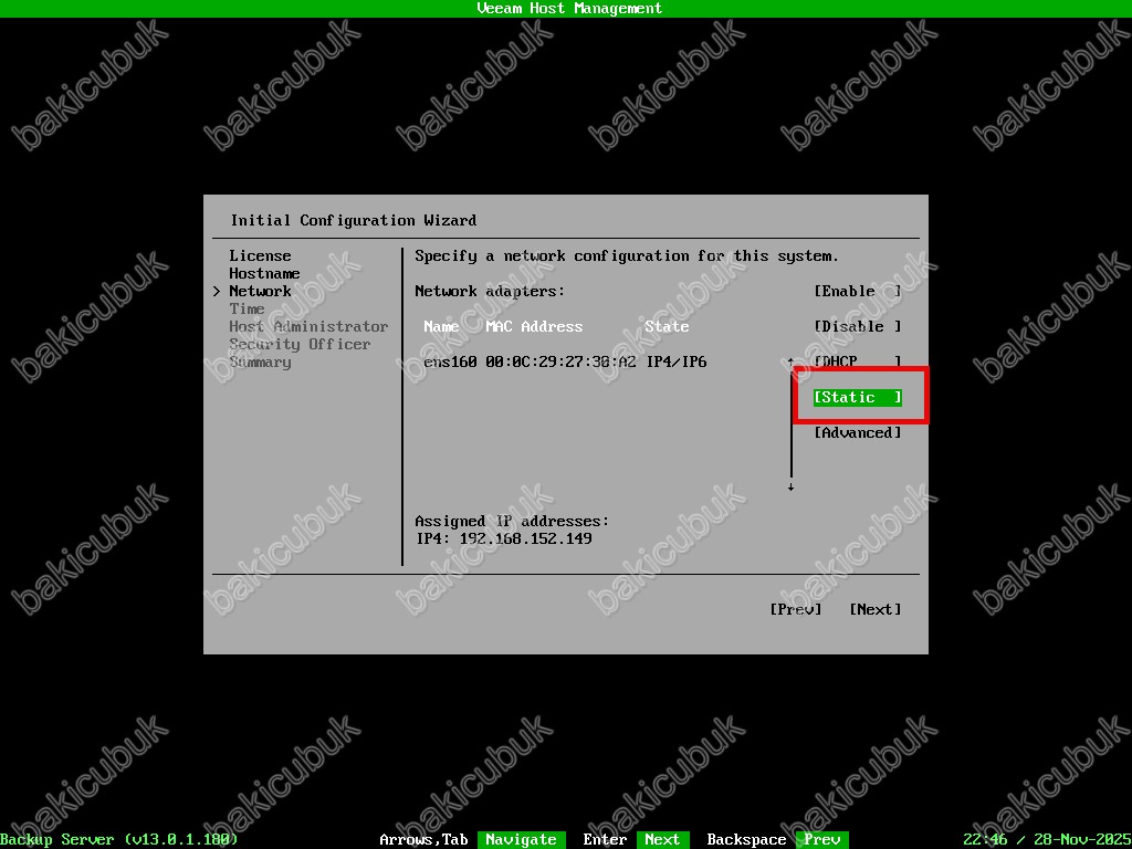 Network ekranında Network adapters bölümü altında Veeam Software Appliance 13.0.1.180 kurulumunu yaptığımız sunucumuz üzerinde ens160 isimli Network kartınına Statik IP adresi yapılandırmak için Static seçeneğine seçiyoruz ve Enter tuşuna basarak devam ediyoruz.