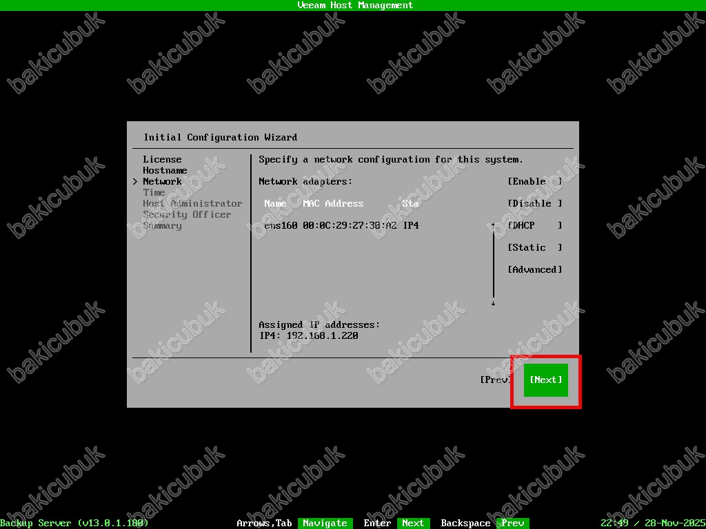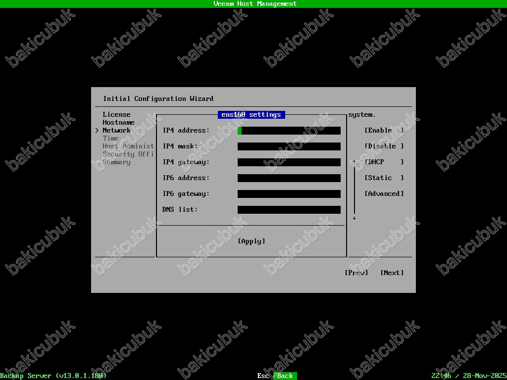 Veeam Software Appliance 13.0.1.180 kurulumunu yaptığımız sunucumuz üzerinde ens160 isimli Network kartınına Statik IP adresi yapılandırmak için IP4 address, IP4 mask, IP4 gateway ve DNS list seçeneklerini yapılandırmamız gerekiyor.
