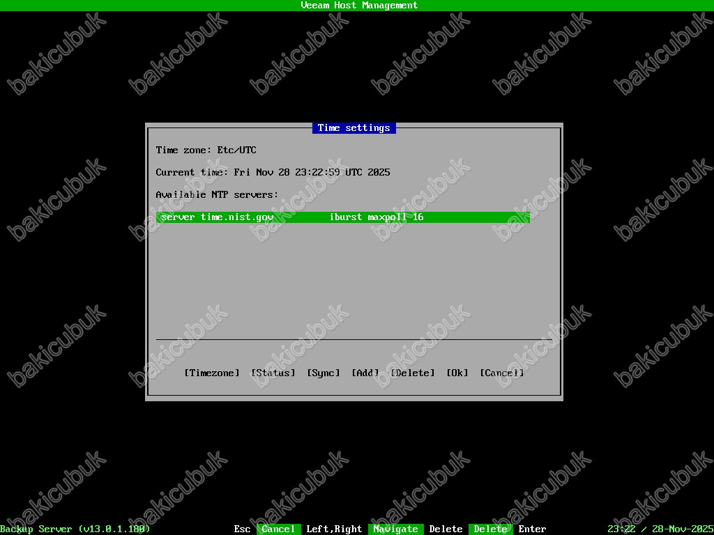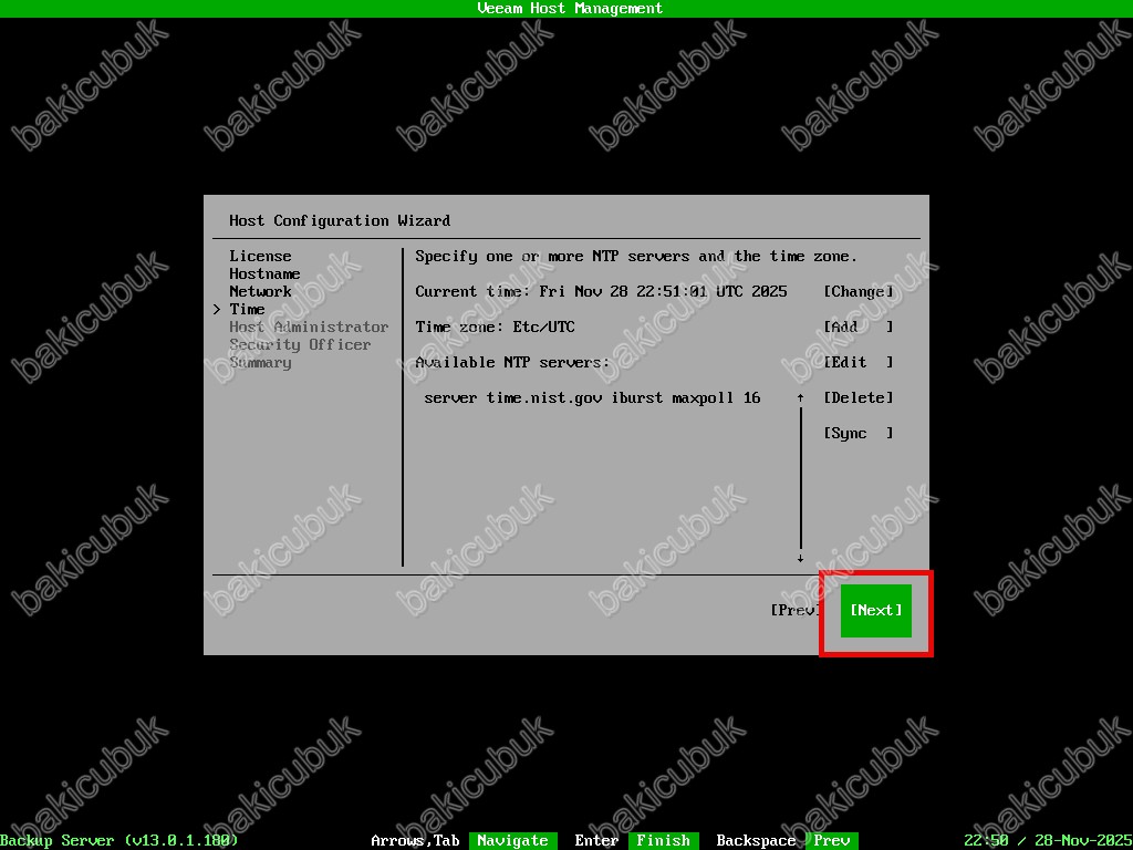 Time ekranında Veeam Software Appliance 13.0.1.180 kurulumunu yaptığımız sunucumuz üzerinde saat dilimi ve tarih/saat bilgilerini yapılandırabilirsiniz. NTP yapılandırmasını yaparak doğru zaman senkronizasyonunu sağlayabilirsiniz. İhmal edilmemesi gereken önemli adımdır. Özellikle canlı ortamlarda NTP sunucusu yapılandırması önemlidir. Bu, güvenlik açısından çok önemli bir noktadır.