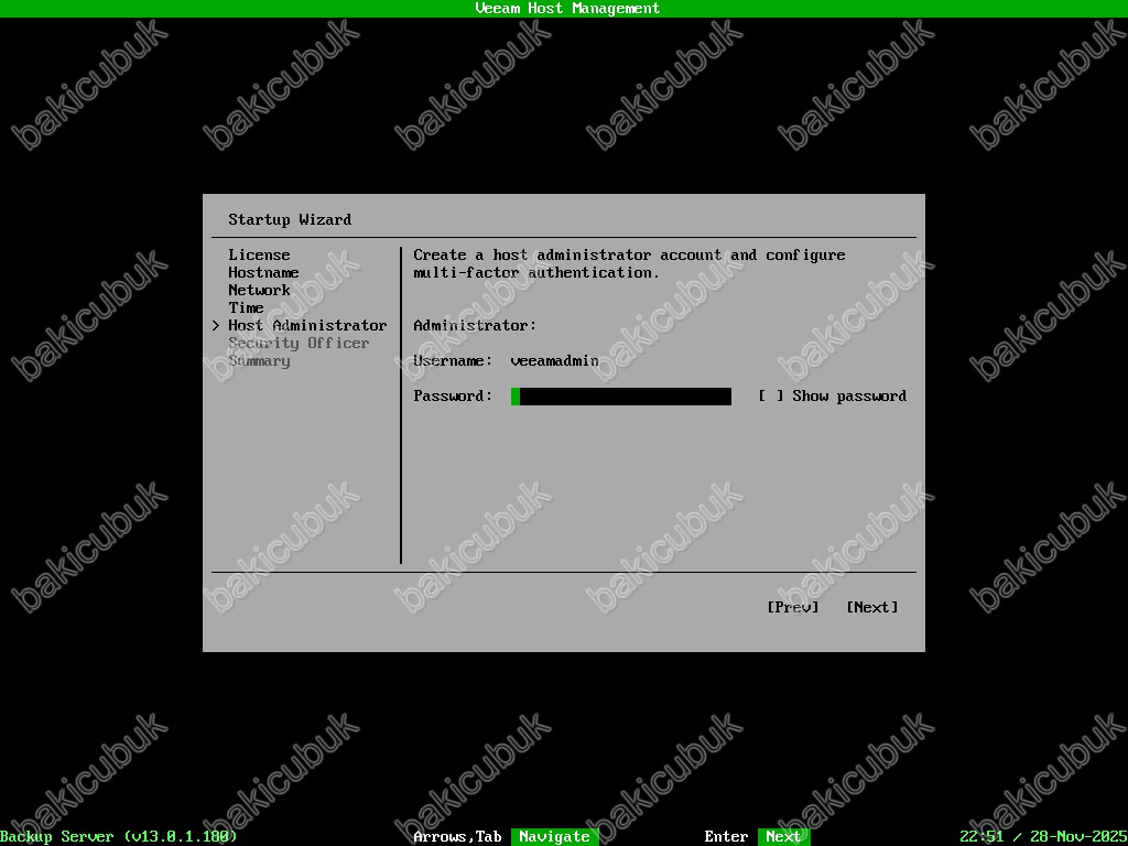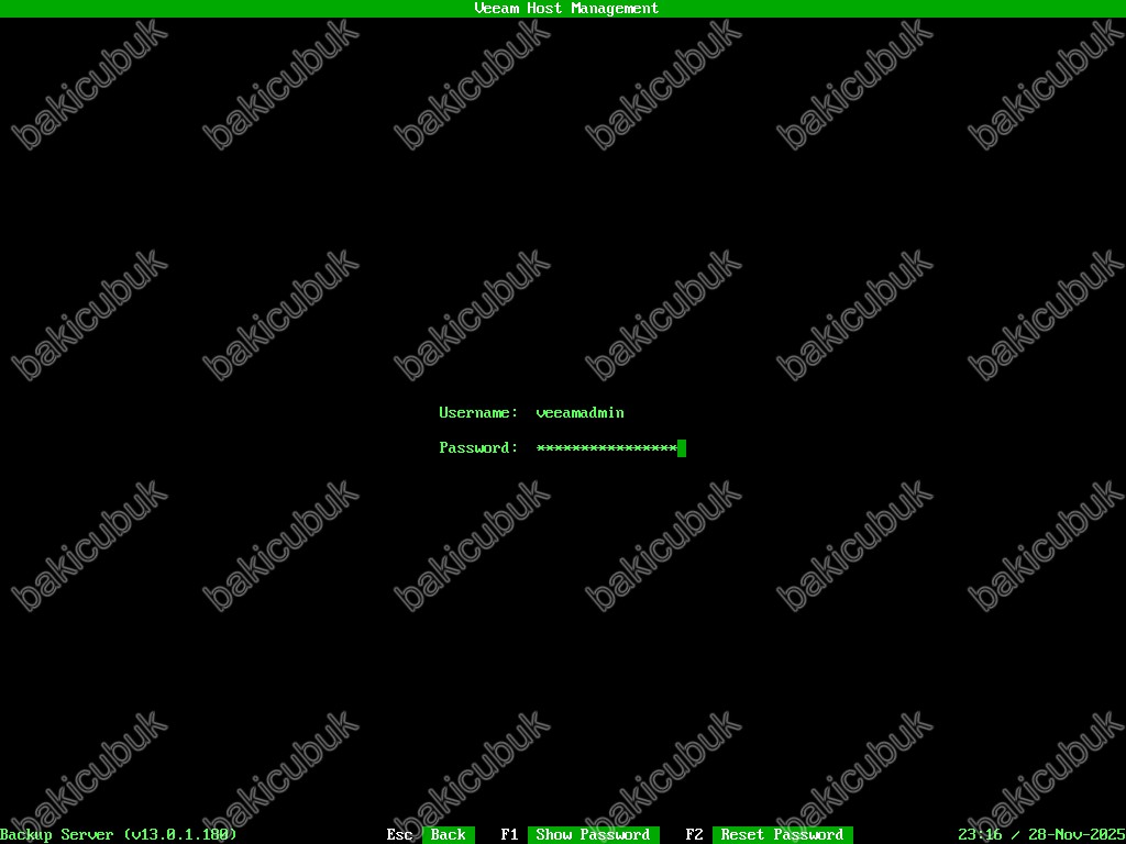 Host Administrator ekranında Veeam Software Appliance 13.0.1.180 üzerinde varsayılan olarak gelen veeamadmin isimli Host Admin (Sunucu Yöneticisi) hesabı için bir Password (Parola) yapılandırmamız gerekiyor.