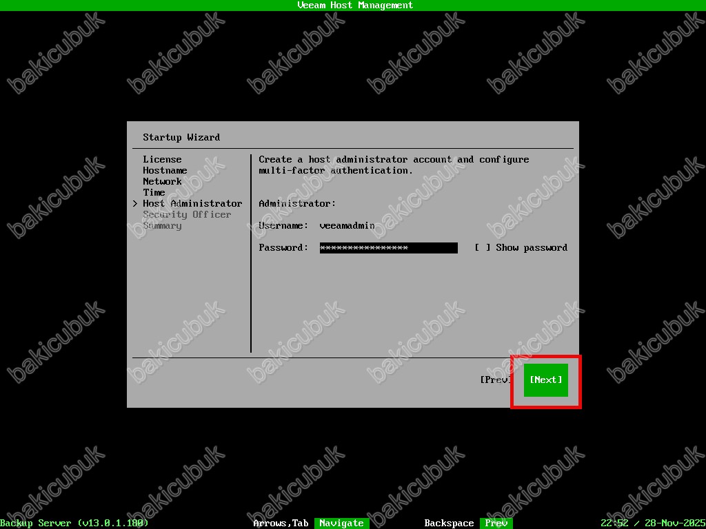 Host Administrator ekranında Veeam Software Appliance 13.0.1.180 üzerinde varsayılan olarak gelen veeamadmin isimli Host Admin (Sunucu Yöneticisi) hesabı için bir Password (Parola) yapılandırıyoruz.