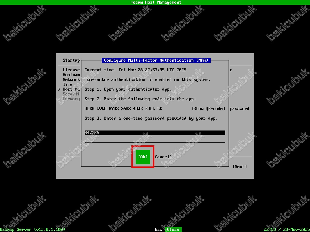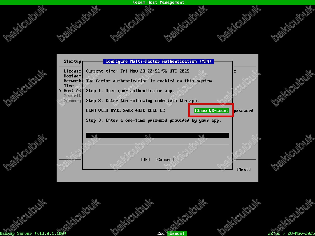 Configure Multi-Factor Authentication (MFA) ekranında Veeam Software Appliance 13.0.1.180 üzerinde güvenliğini artırmak için MFA (Multi-Factor Authentication) etkinleştirmek zorunludur.