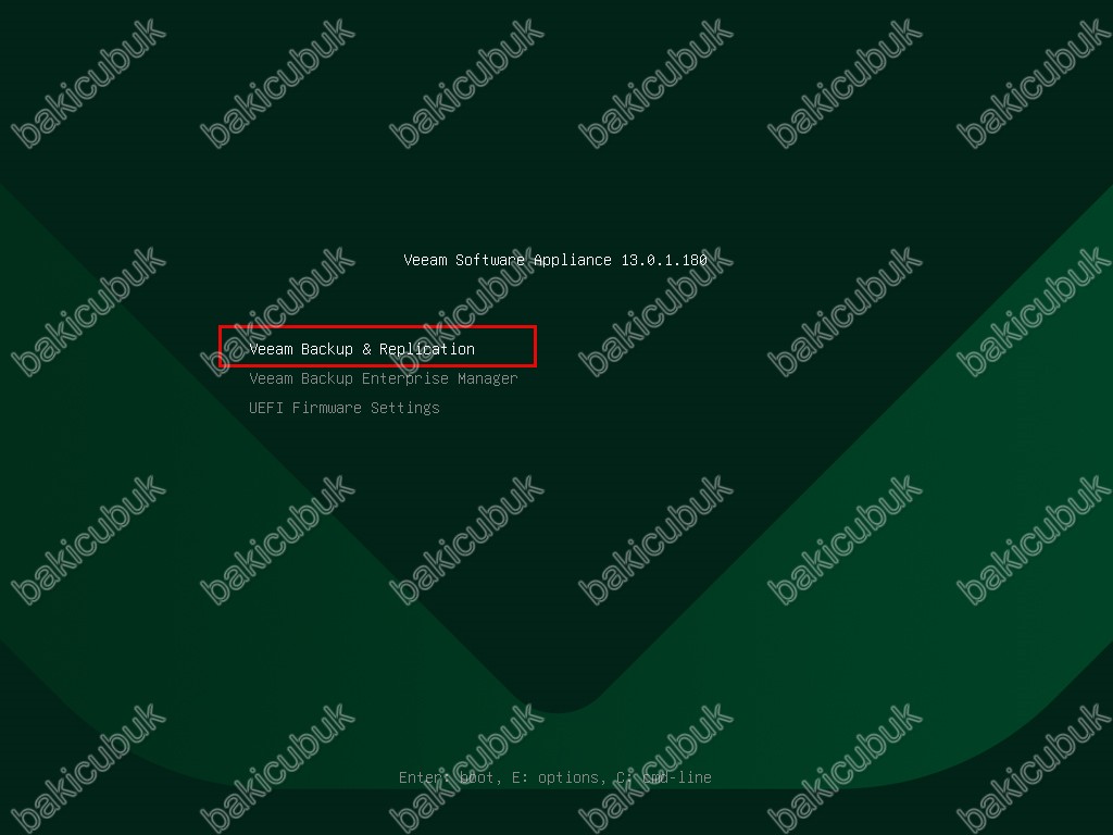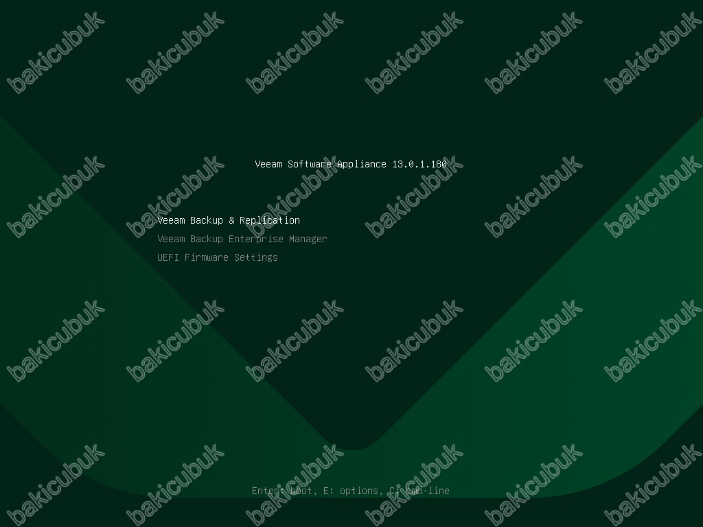 İndirmiş olduğumuz Veeam Software Appliance 13.0.1.180 kurulum ISO dosyasını sunucumuza mount ettikten sonra sunucuyu başlatarak kurulum sürecini başlatabiliriz. Sunucu açıldığında ISO üzerinden otomatik olarak önyükleme yapılır ve karşımıza Veeam’in kurulum başlangıç ekranı gelir.