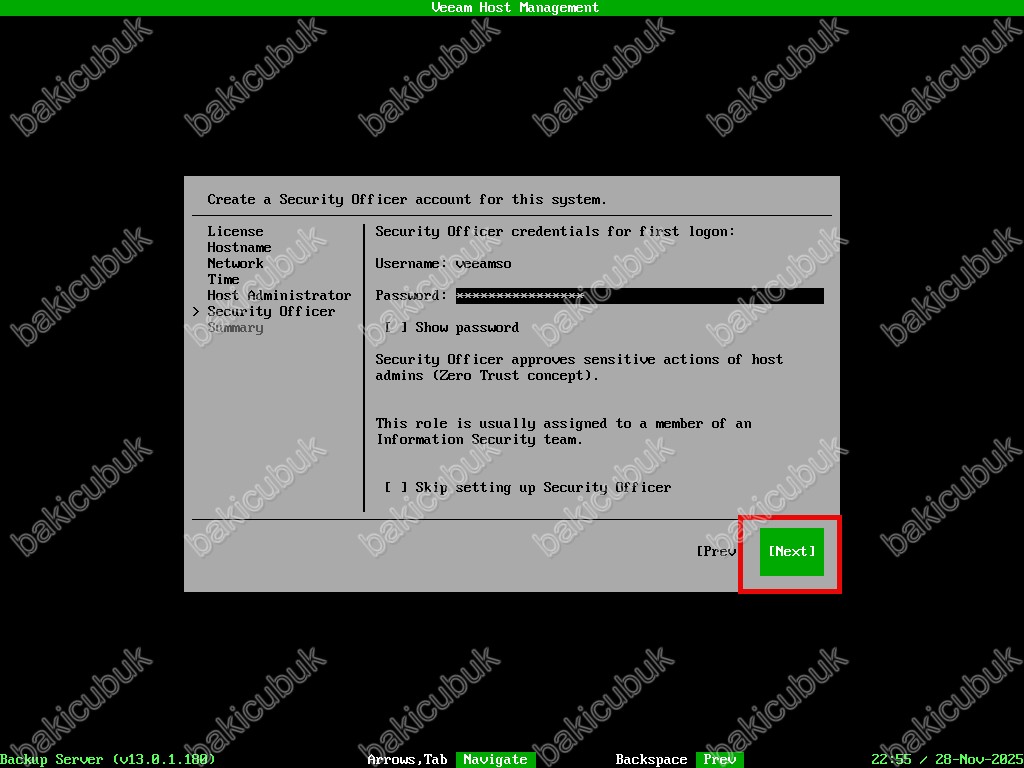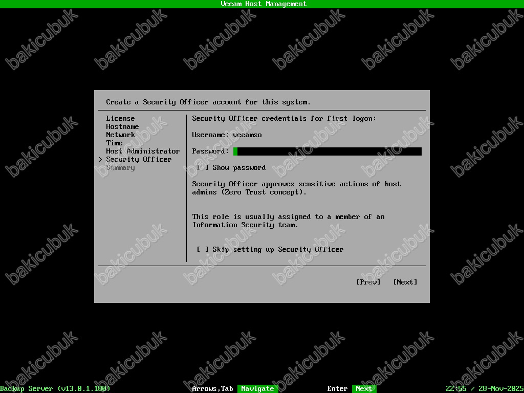 Security Officer ekranında Skip setting up Security Officer seçeneği ile yapılandırmadan devam edebilirsiniz. Ancak Veeam Software Appliance 13.0.1.180 kurulumundan sonra yapılandırmanız gerekmektedir.