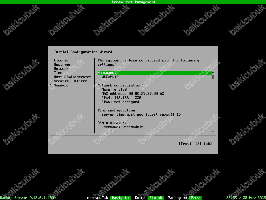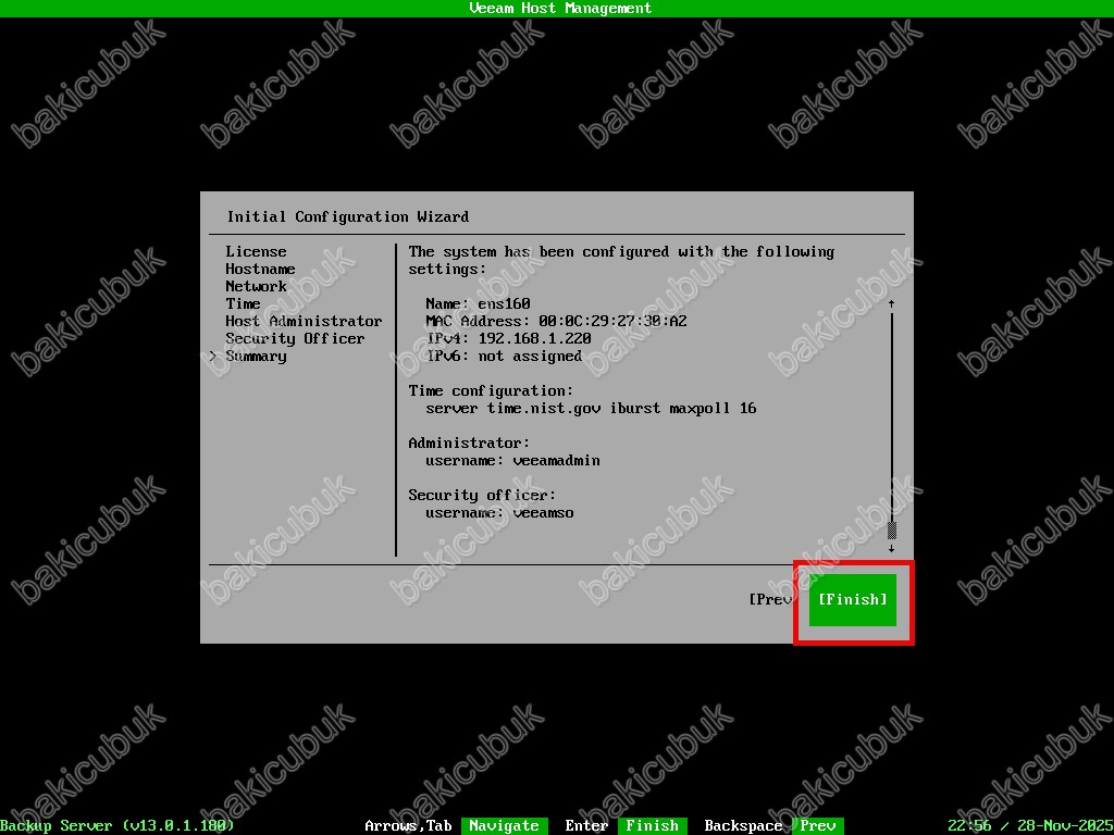 Summary ekranında Veeam Software Appliance 13.0.1.180 kurulumu ve yapılandırması için yapmış olduğumuz bütün yapılandırmanın özetini görüyoruz.