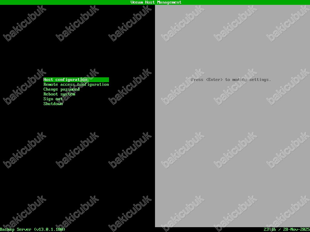 Veeam Host Management ekranında Remote access configuration seçeneğini seçiyoruz ve Enter tuşuna basarak devam ediyoruz.