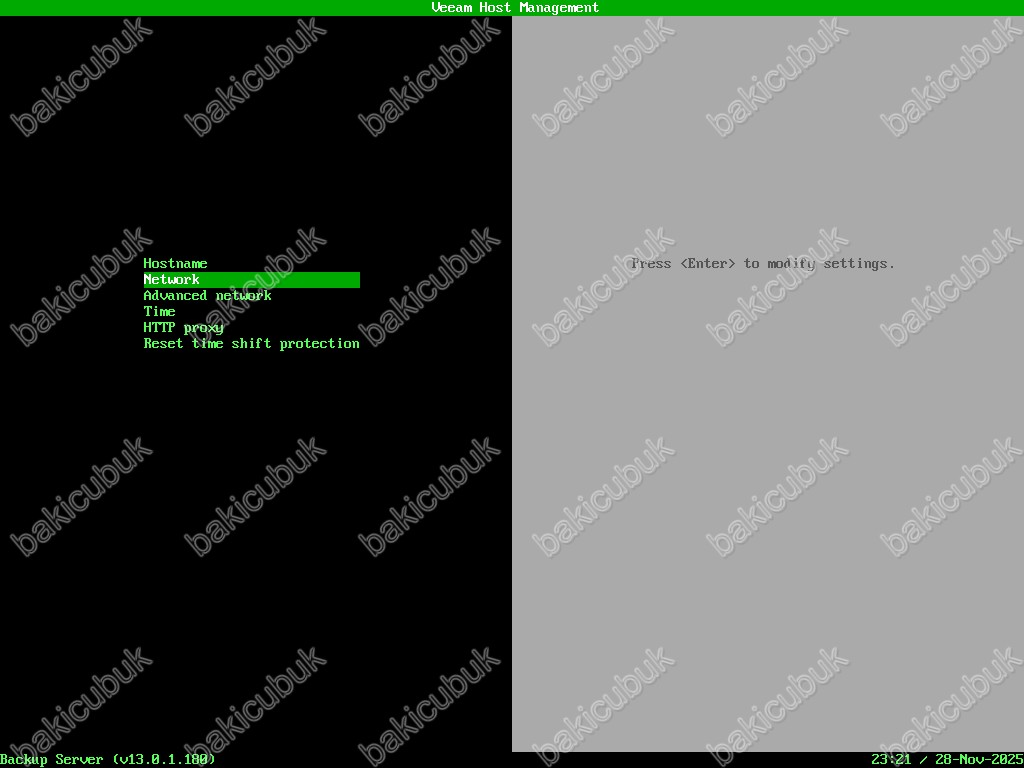 - Network: Veeam Software Appliance 13.0.1.180 sunucunuz üzerinde Hostname yapılandırması, Domain yapılandırması ve Network kartı ya da Network kartları üzerinde gerekli yapılandırmaları değiştirebilirsiniz.