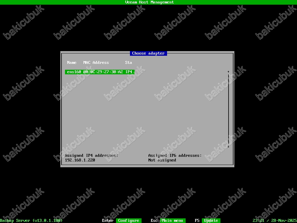 Network ekranında Network adapters bölümü altında Veeam Software Appliance 13.0.1.180 kurulumunu yaptığımız sunucumuz üzerinde ens160 isimli Network kartını ve Assigned IP addresses bölümü altında sunucumuzun DHCP Server üzerinden IP adresi almışsa IP adresi bilgisini görüyoruz.