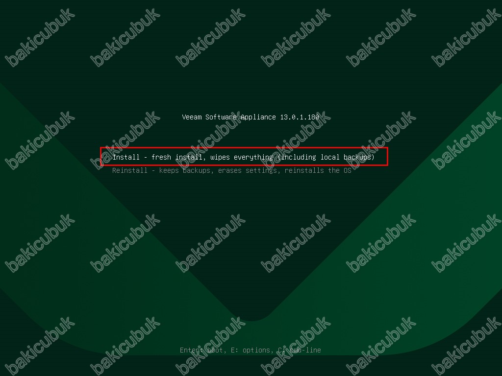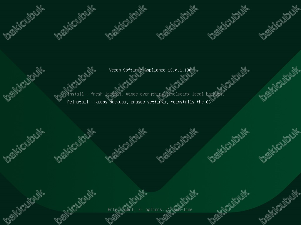 - Install – fresh install, wipes everything: Bu seçenekte tamamen temiz bir kurulum gerçekleştirir. Bu yöntem kullanıldığında sunucu üzerinde daha önce yapılmış tüm Veeam Software Appliance kurulumları, yapılandırmalar ve varsa yerel yedekler geri döndürülemez şekilde silinir. Dolayısıyla sunucuda daha önce Veeam Software Appliance yapılandırması bulunuyor ve bu kurulumun devamında mevcut verilerin saklanması isteniyorsa Install seçeneği kullanılmamalıdır. Ancak sistemi ilk defa kuruyorsanız ya da mevcut ortamdan tamamen bağımsız, sıfırdan bir yapılandırma oluşturmak istiyorsanız Install seçeneği ile devam etmek doğru yaklaşımdır.
