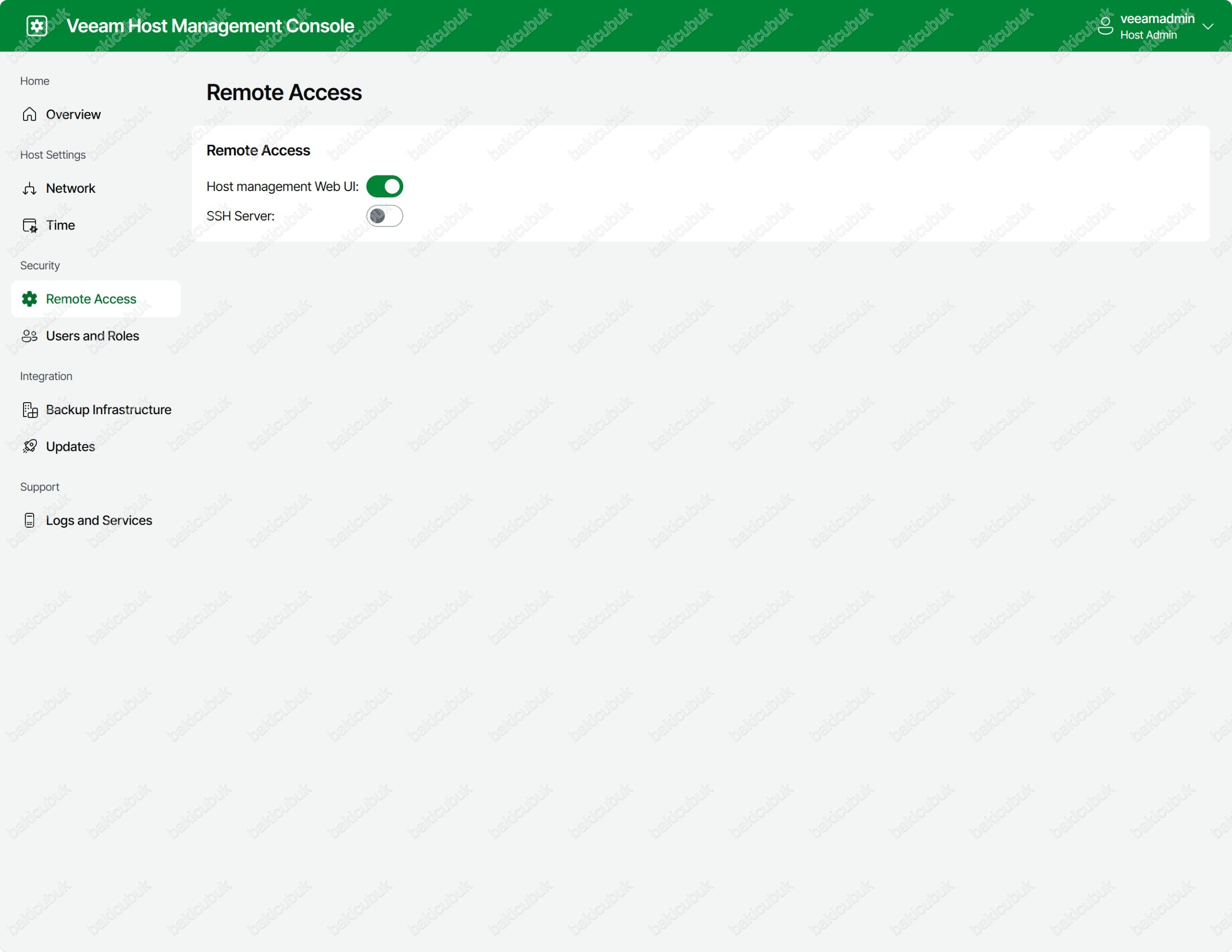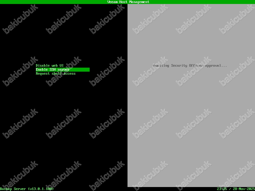 - Enable SSH server: SSH erişimini etkinleştirebilirsiniz. (Bu işlem için veeamso isimli Security Officer (Güvenlik Yetkilisi) hesabının onayı gerekmektedir.)