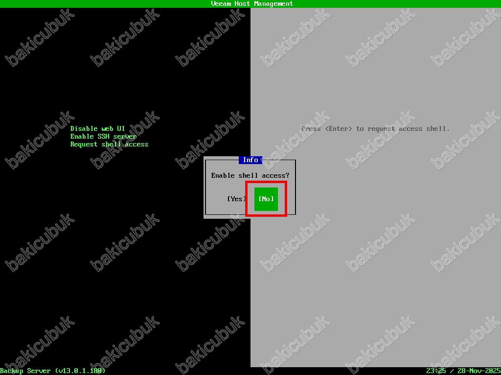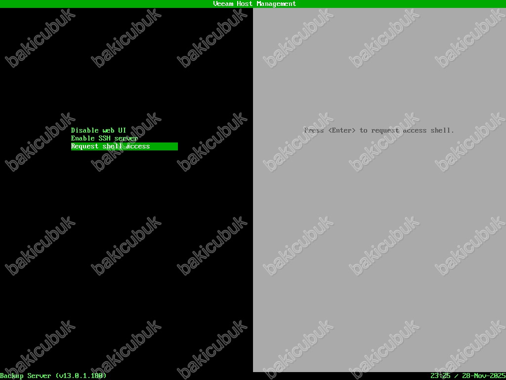 Veeam Host Management ekranında Request shell access seçeneğini seçiyoruz ve Enter tuşuna basarak devam ediyoruz.