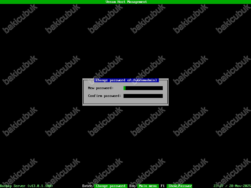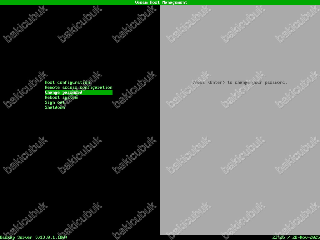 Veeam Host Management ekranında Change password seçeneğini seçiyoruz ve Enter tuşuna basarak devam ediyoruz.
