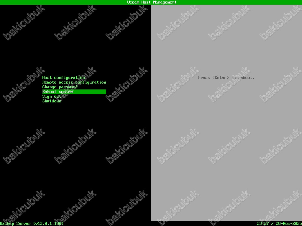 Veeam Host Management ekranında Reboot system seçeneği ile Veeam Software Appliance 13.0.1.180 sunucunuzu yeniden başlatabilirsiniz.