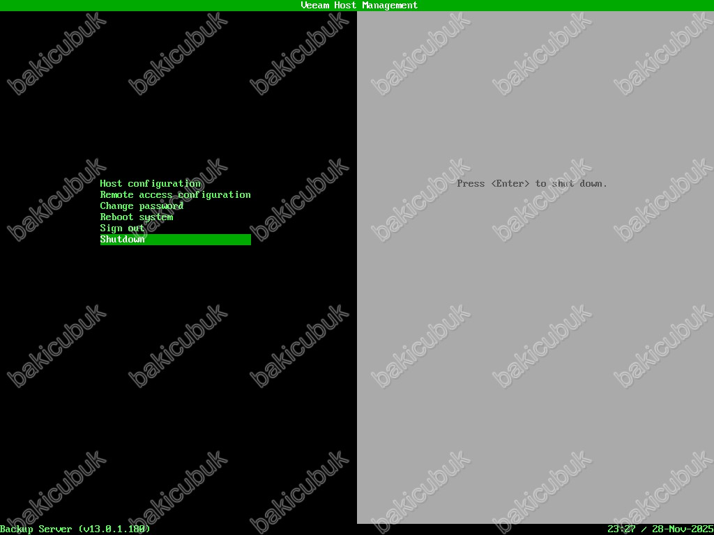 Veeam Host Management ekranında Shutdown seçeneği ile Veeam Software Appliance 13.0.1.180 sunucunuzu kapatabilirsiniz.