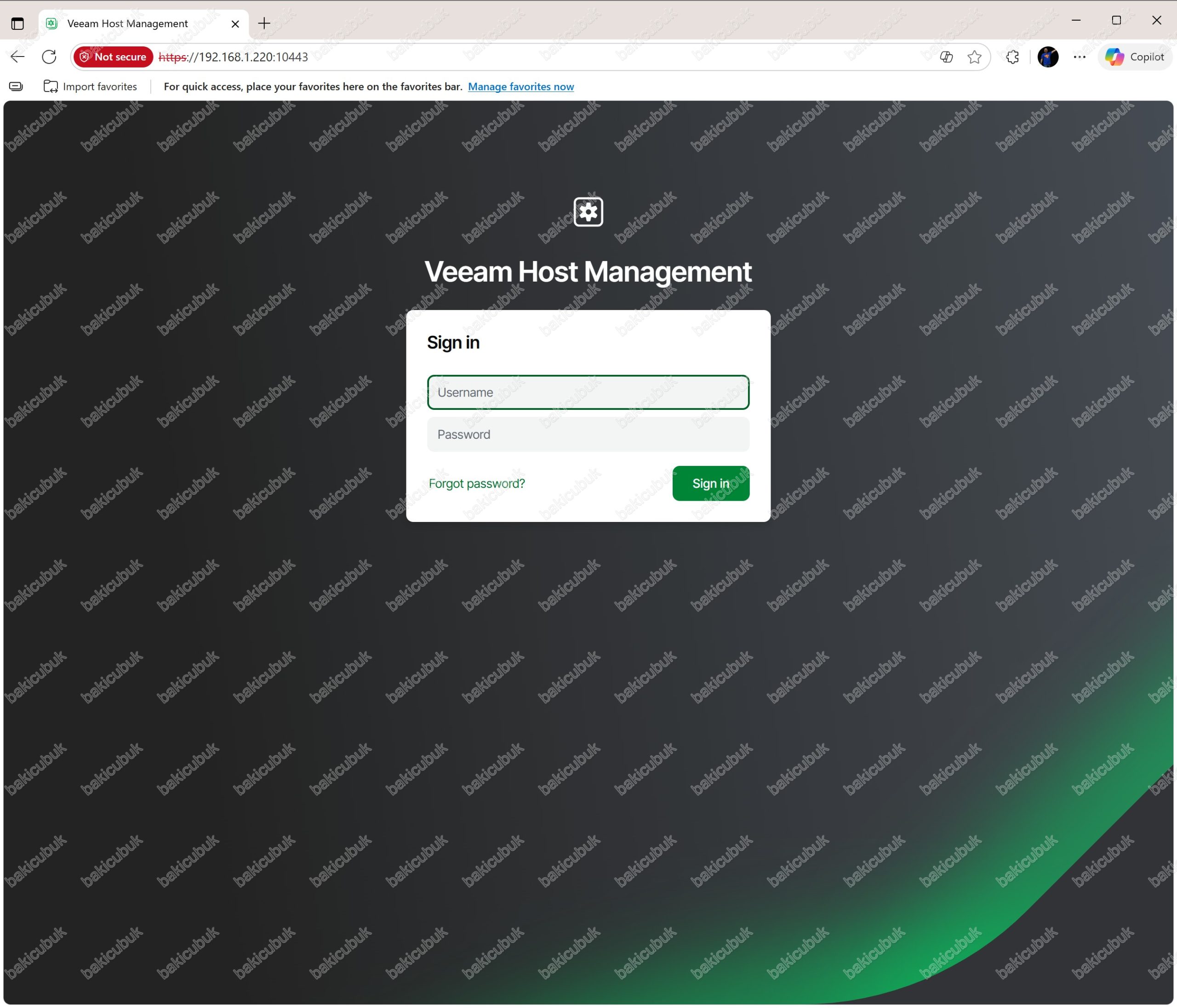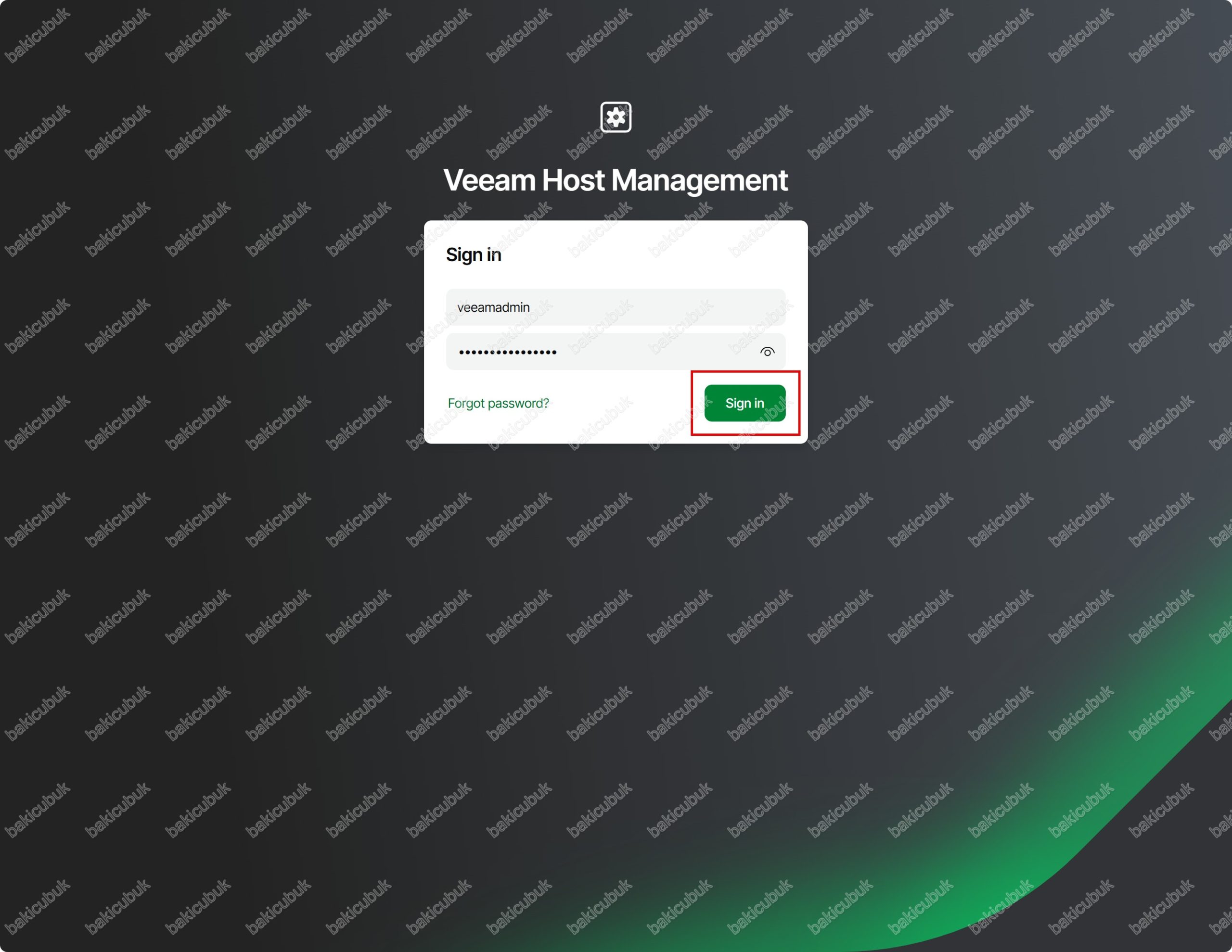 Veeam Host Management Console ekranında Sing in adımında Username (Kullanıcı adı) ve Password (Parola) bölümlerine Veeam Software Appliance 13.0.1.180 kurulumu ve yapılandırmasında yapılandırmış olduğumuz veeamadmin isimli Host Admin (Sunucu Yöneticisi) hesabının bilgilerini giriyoruz ve Sign in seçeneği ile giriş yapıyoruz.