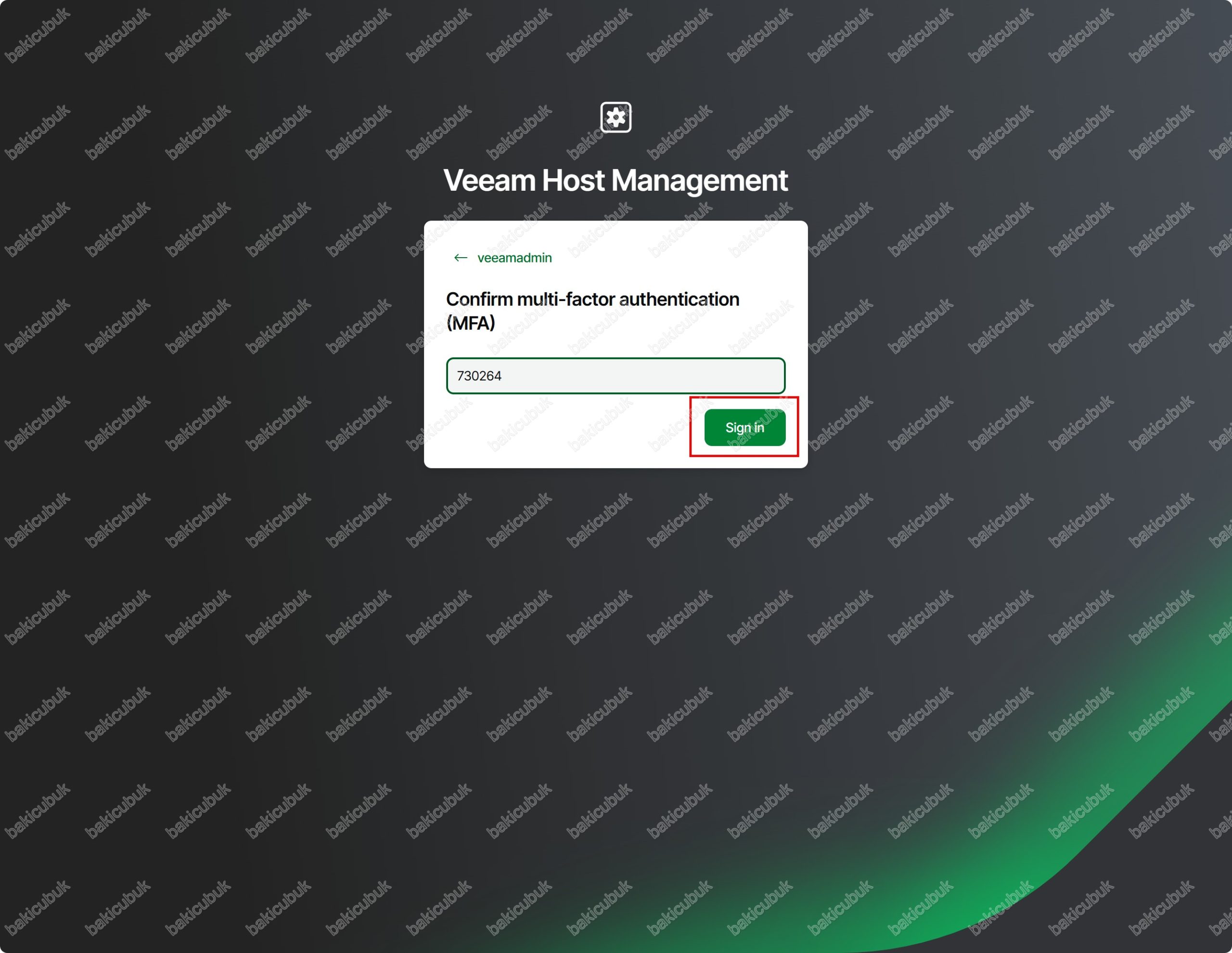 Veeam Host Management Console ekranında Confirm multi-factor authentication (MFA) adımında bölümüne cep telefonunuz üzerinde yapılandırmış olduğumuz MFA (Multi-Factor Authentication) mobil uygulaması (Google Authenticator veya Microsoft Authenticator) bulunan kodu giriyoruz ve Sign in seçeneği ile giriş yapıyoruz.