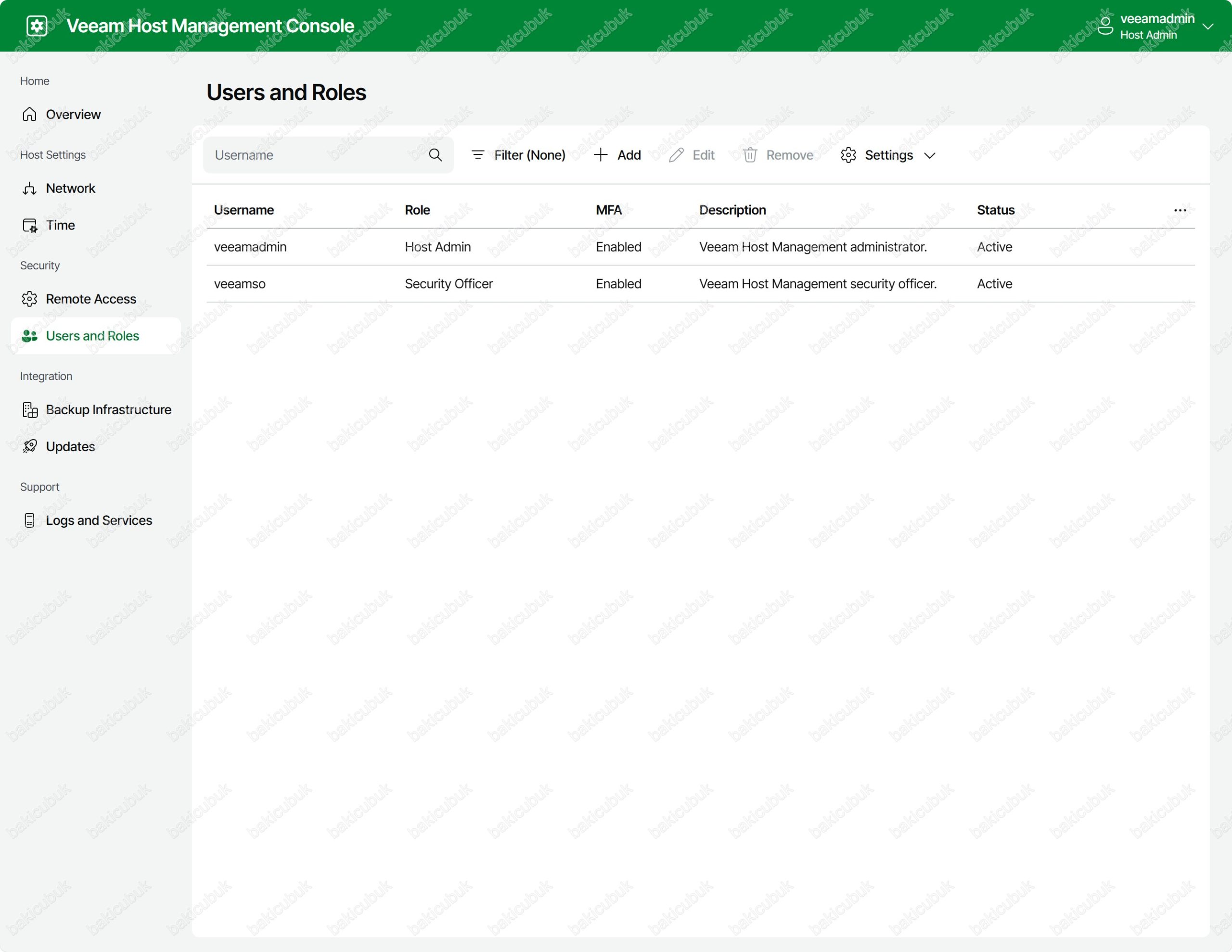 Veeam Host Management Console ekranında Users and Roles menüsünde