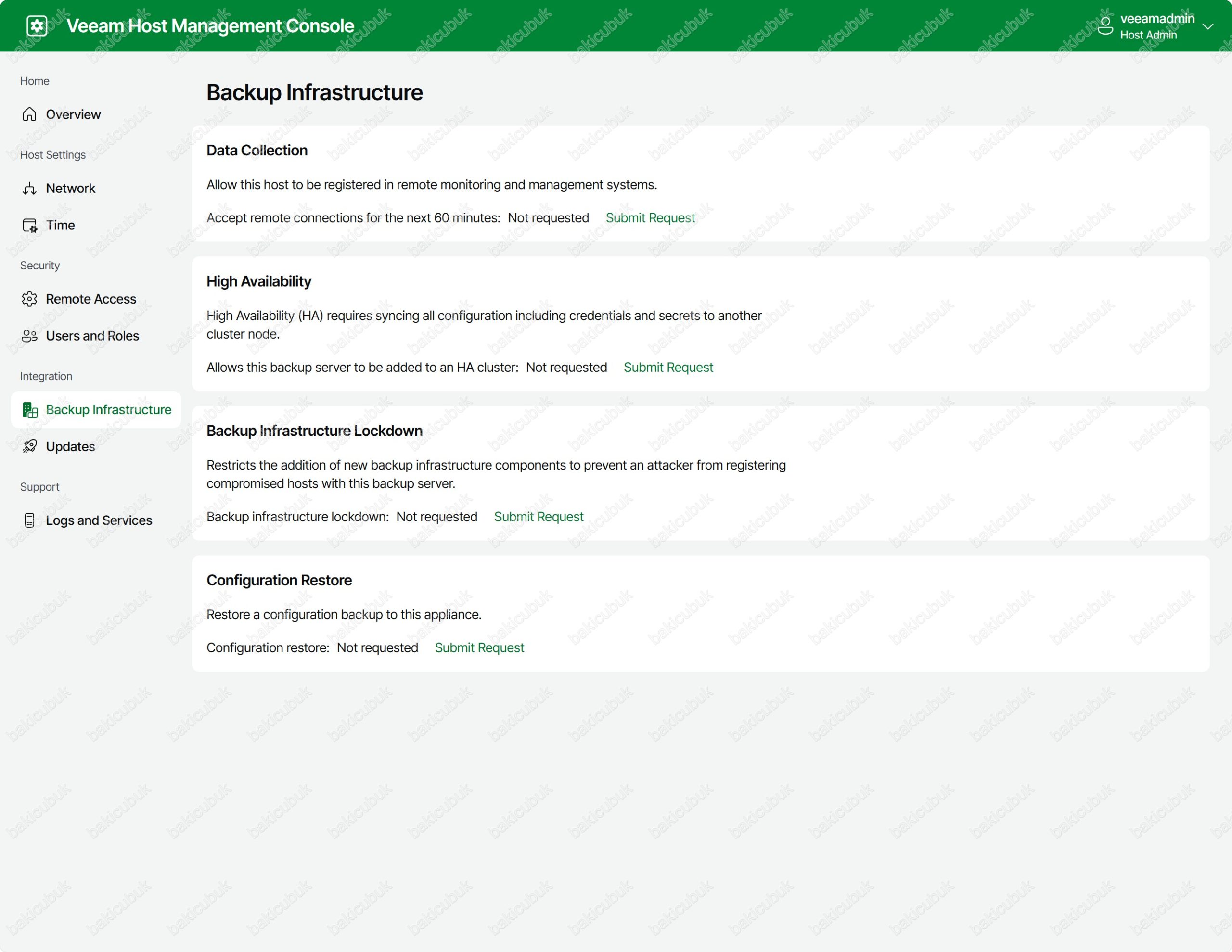 - Backup Infrastructure: Veeam Software Appliance 13.0.1.180 sunucunuz üzerinde Data Collection, High Availability, Backup Infrastructure lockdown ve Configuration Restore gibi gerekli yapılandırmaları değiştirebilirsiniz.