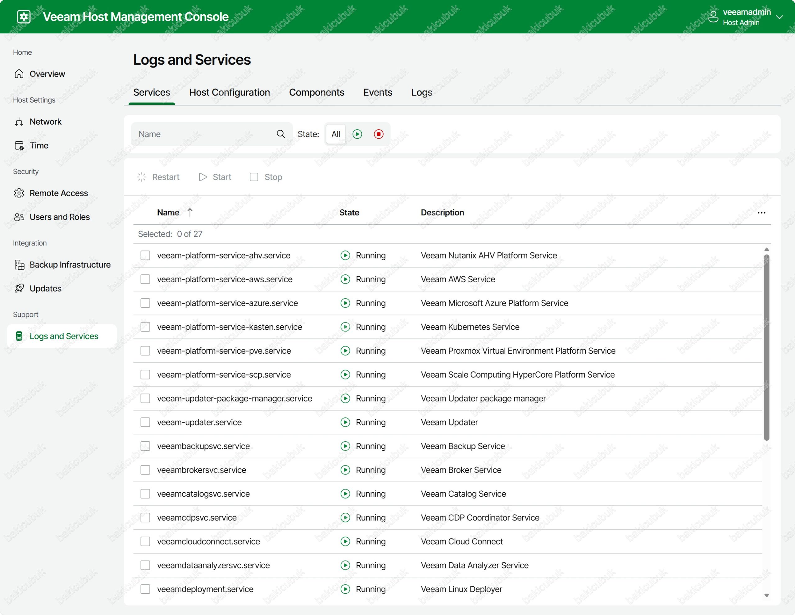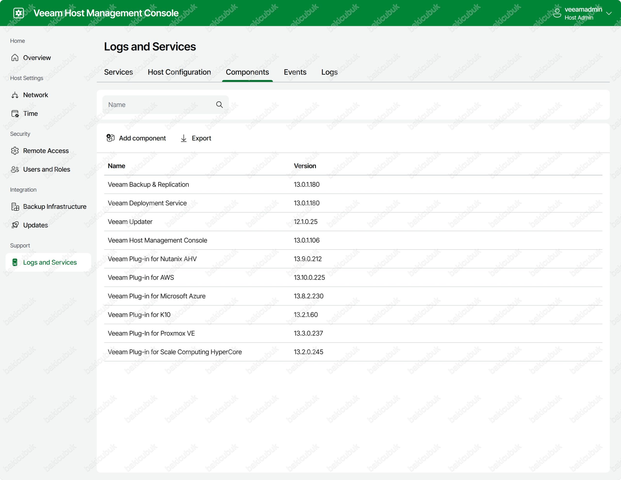 Veeam Host Management Console ekranında Log and Services menüsünde Components sekmesi altında