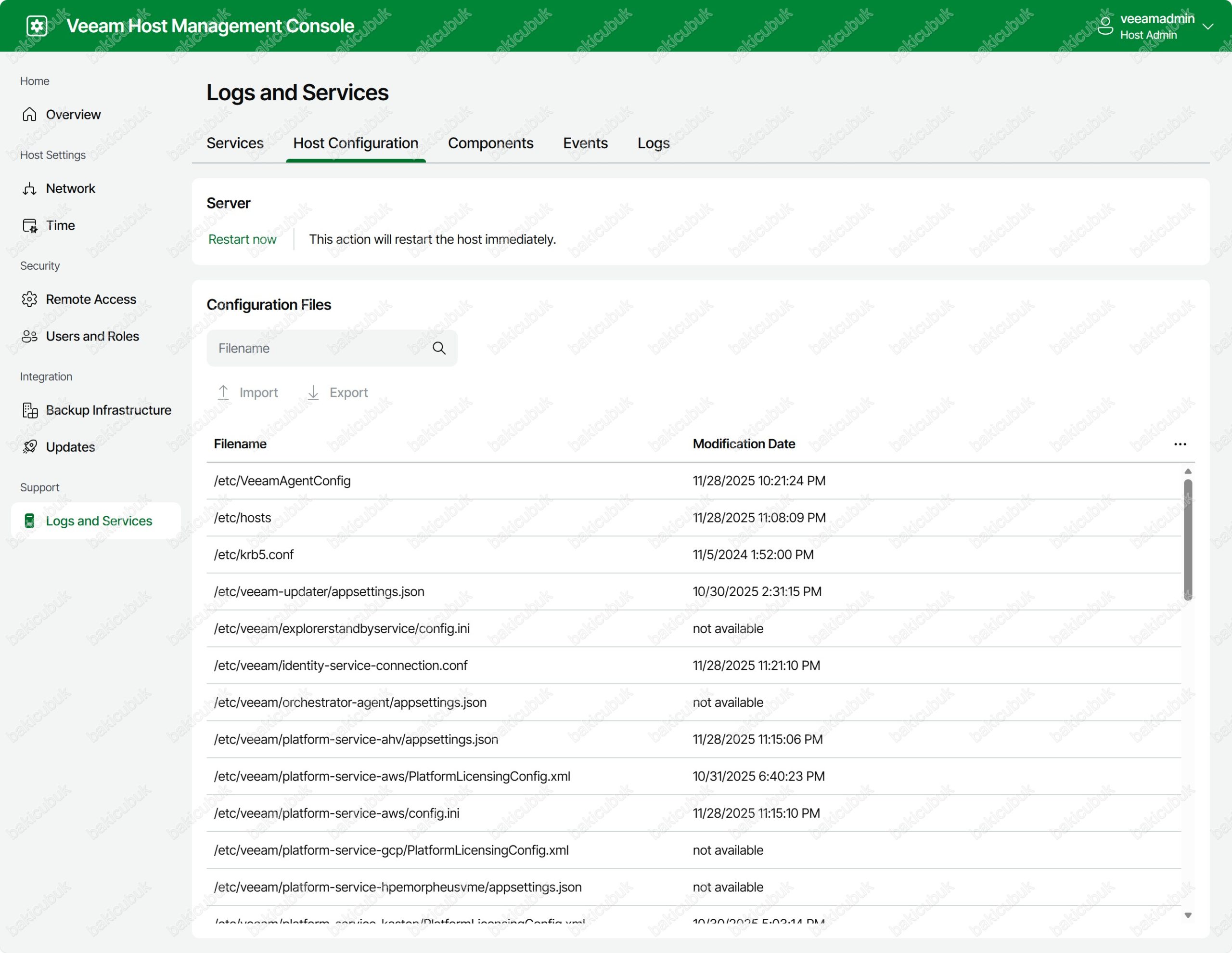 Veeam Host Management Console ekranında Log and Services menüsünde Host Configuration sekmesi altında