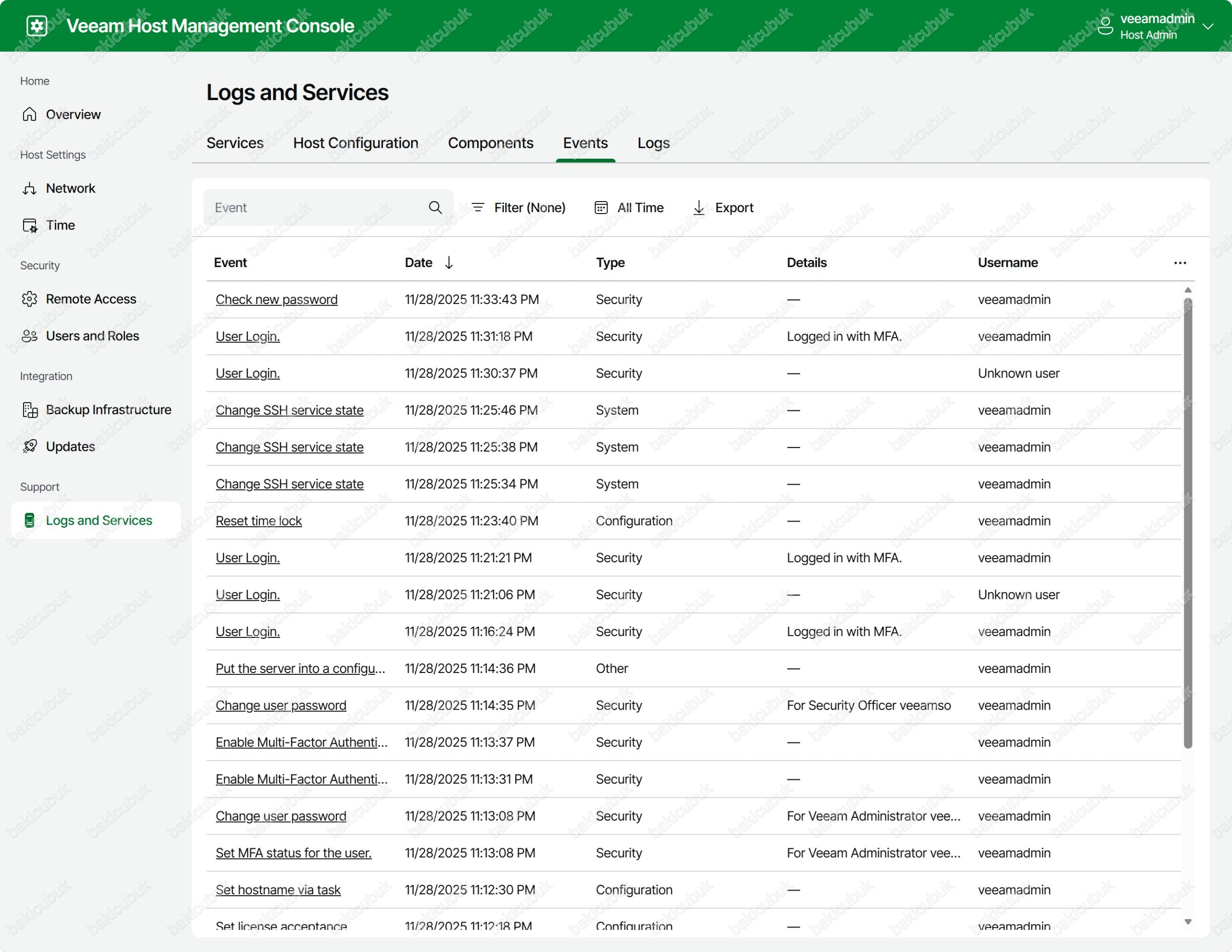 Veeam Host Management Console ekranında Log and Services menüsünde Events sekmesinde Veeam Software Appliance 13.0.1.180 sunucusu üzerinde gerçekleştirilen tüm eylemlerin ve işlemleri kontrol edebilirsiniz.