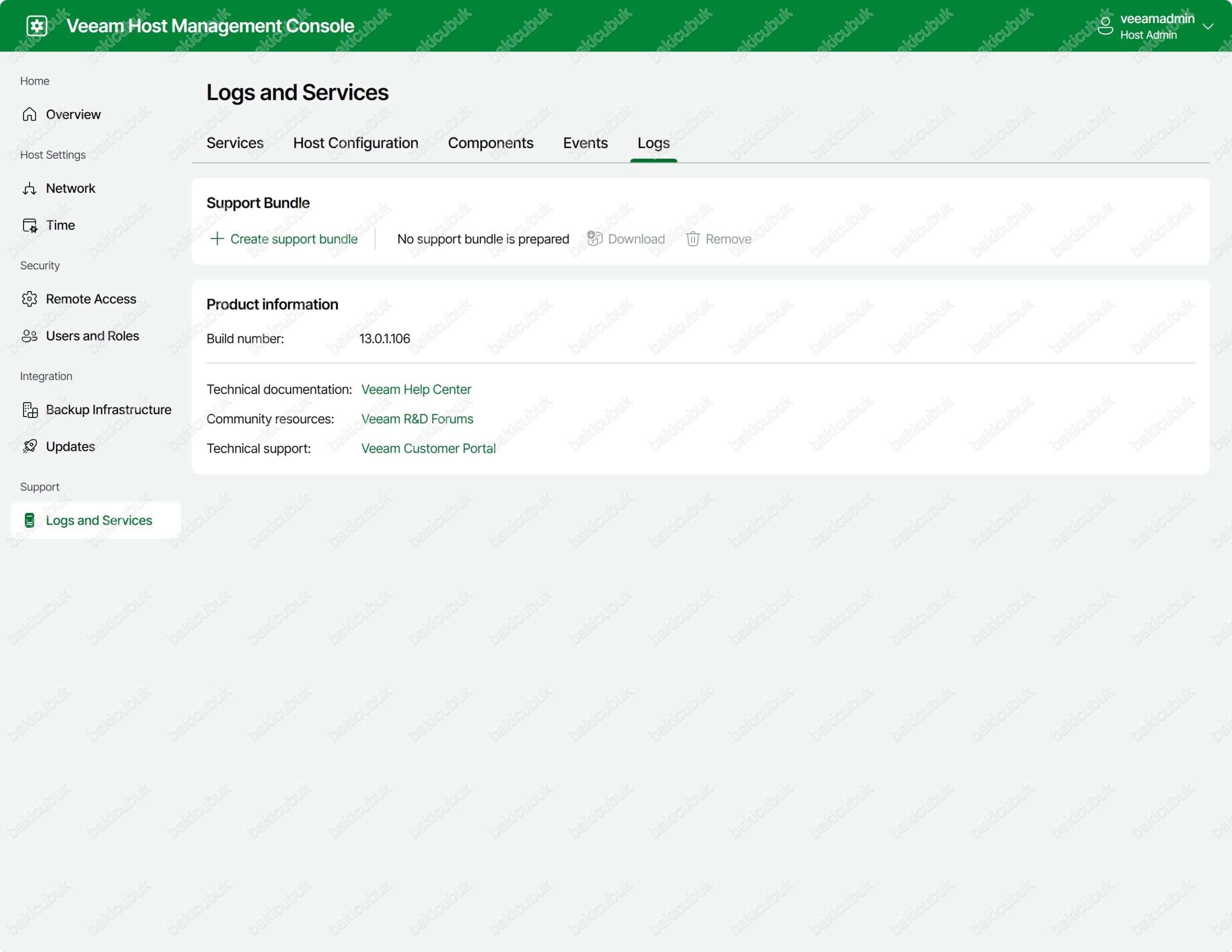 - Logs and Services: Veeam Software Appliance 13.0.1.180 sunucunuz üzerinde servisler, yapılandırmalar ve log bilgileri gibi gerekli yapılandırmaları değiştirebilirsiniz.