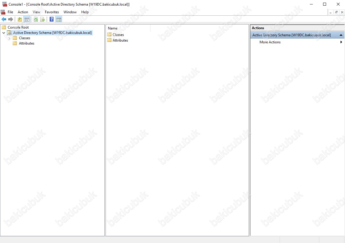 Active Directory Schema konsolunun W19DC isimli Windows Server 2019 işletim sisteme sahip sunumuza bağlantı sağlandığını Active Directory Schema [W19DC.bakicubuk.local] olarak görüyoruz.