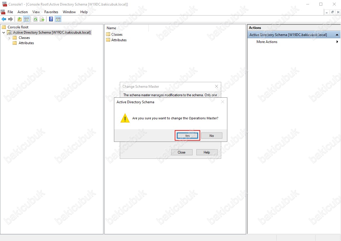 Active Directory Schema konsolun da Active Directory Schema [W19DC.bakicubuk.local] üzerinde sağ tuş Operations Master… seçeneğine tıklıyoruz.