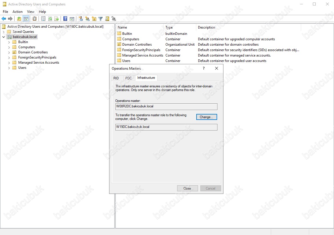 Operations Masters ekranın da Infrastructure sekmesin de W08R2DC isimli Windows Server 2008 R2 işletim sistemine sahip sunucumuz üzerindeki Infrastructure rolünü W19DC isimli Windows Server 2019 işletim sistemine sahip sunucumuz üzerine taşımak için Change diyerek taşıma işlemini gerçekleştiriyoruz.