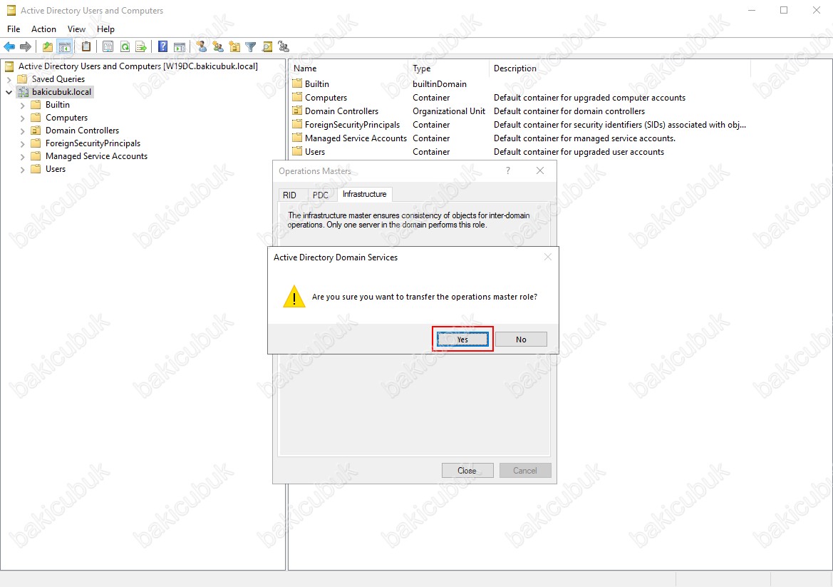 Active Directory Domain Services ekranın da W08R2DC isimli Windows Server 2008 R2 işletim sistemine sahip sunucumuz üzerindeki Infrastructure rolünü W19DC isimli Windows Server 2019 işletim sistemine sahip sunucumuz üzerine taşımak için Yes diyerek taşıma işlemini gerçekleştiriyoruz.