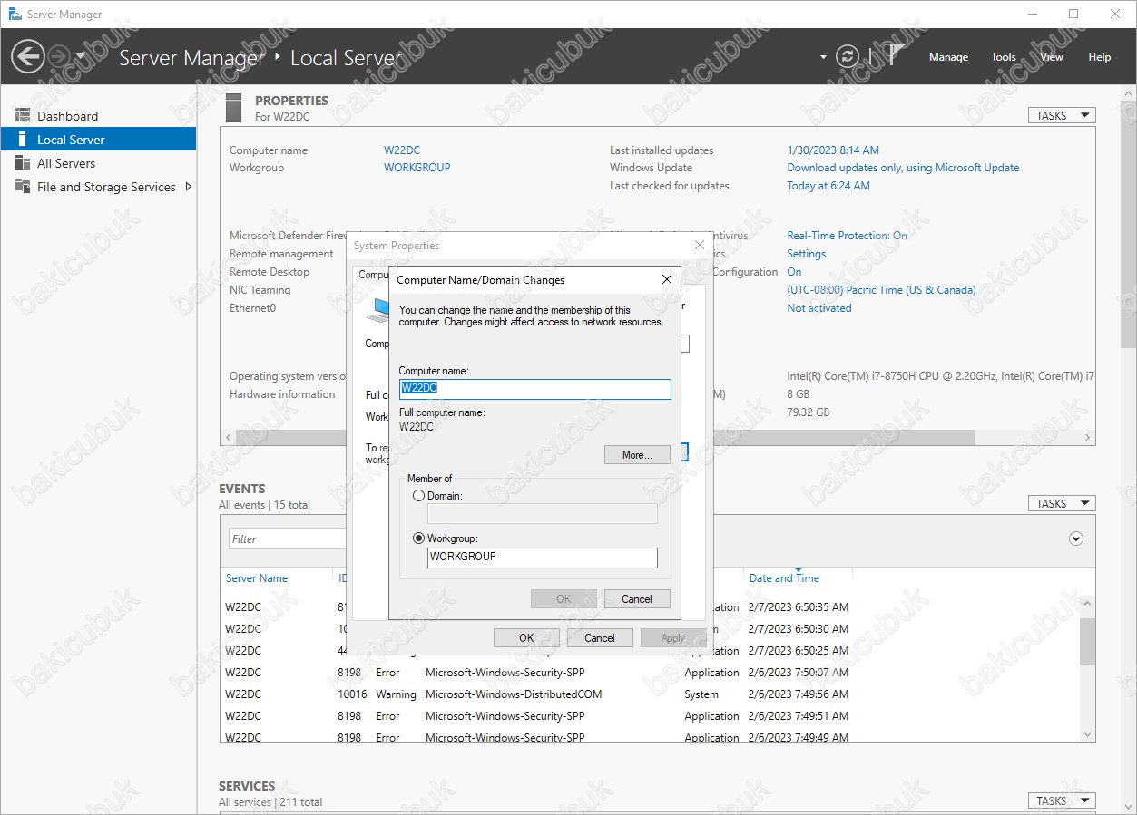 Domain Name bölümü altında bakicubuk.local olarak Active Directory Domain yapısını görüyoruz.