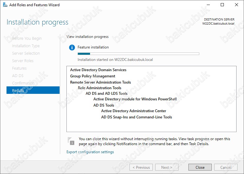 Installation progress ekranın da Active Directory Domain Services rolü ile birlikte diğer özelliklerimiz olan Group Policy Management ve Remote Administration Tools altında bulunan Active Directory Module for Windows Powershell, Active Directory Administrative Center ve AD DS Snap-Ins and Command Line Tools özelliklerinin kurulduğunu görüyoruz.