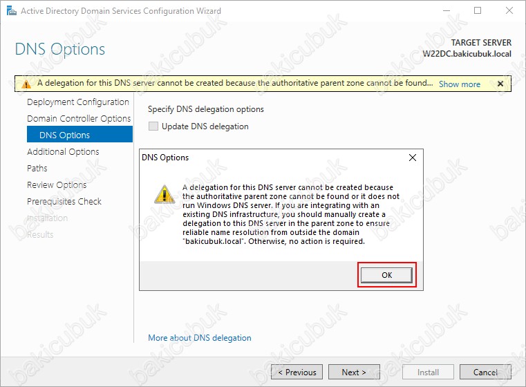 DNS Options ekranın da eğer sunucumuz üzerinde daha önceden bir DNS ( Domain Name Server ) rolü kurulu ise yeni kurulan DNS ( Domain Name Server ) sunucumuzu mevcuttaki DNS ( Domain Name Server ) üzerinde delegasyon ataması için yapılandırabilirsiniz.