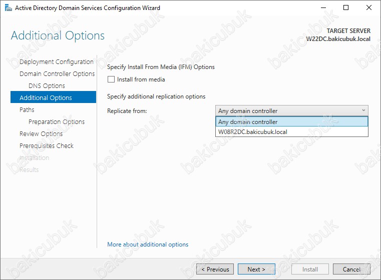 Additional Options ekranın da Specify additional replication options seçeneği altında Replika from bölümün de W08R2DC.bakicubuk.local isimli Windows Server 2008 R2 işletim sistemine sahip sunucumuz görüyoruz.