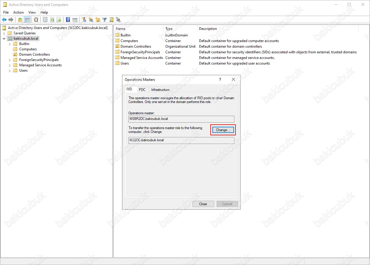 Operations Masters ekranın da RID sekmesin de W03R2DC isimli Windows Server 2003 R2 işletim sistemine sahip sunucumuz üzerindeki RID master rolünü W08R2DC isimli Windows Server 2008 R2 işletim sistemine sahip sunucumuz üzerine taşımak için Change diyerek RID master rolünün taşıma işlemini başlatıyoruz.