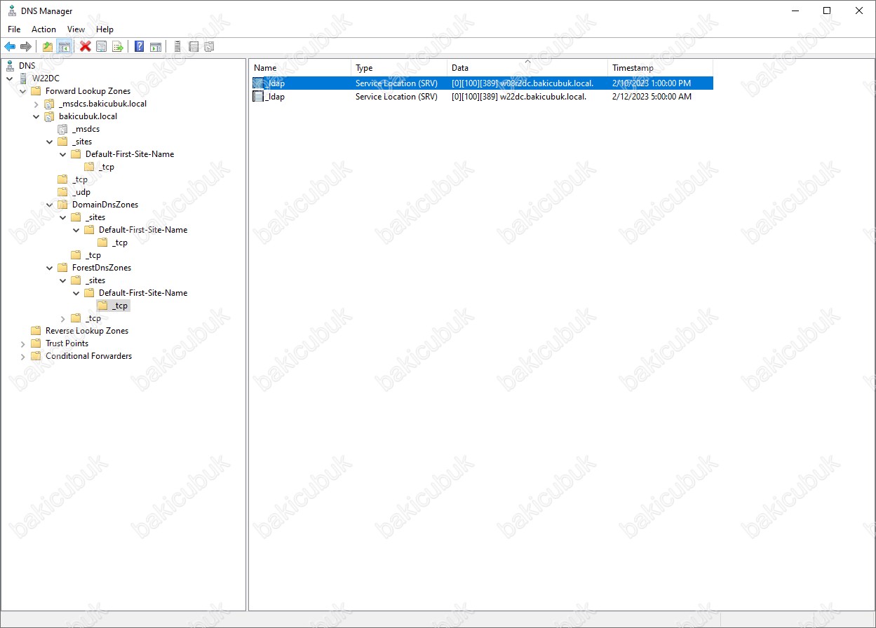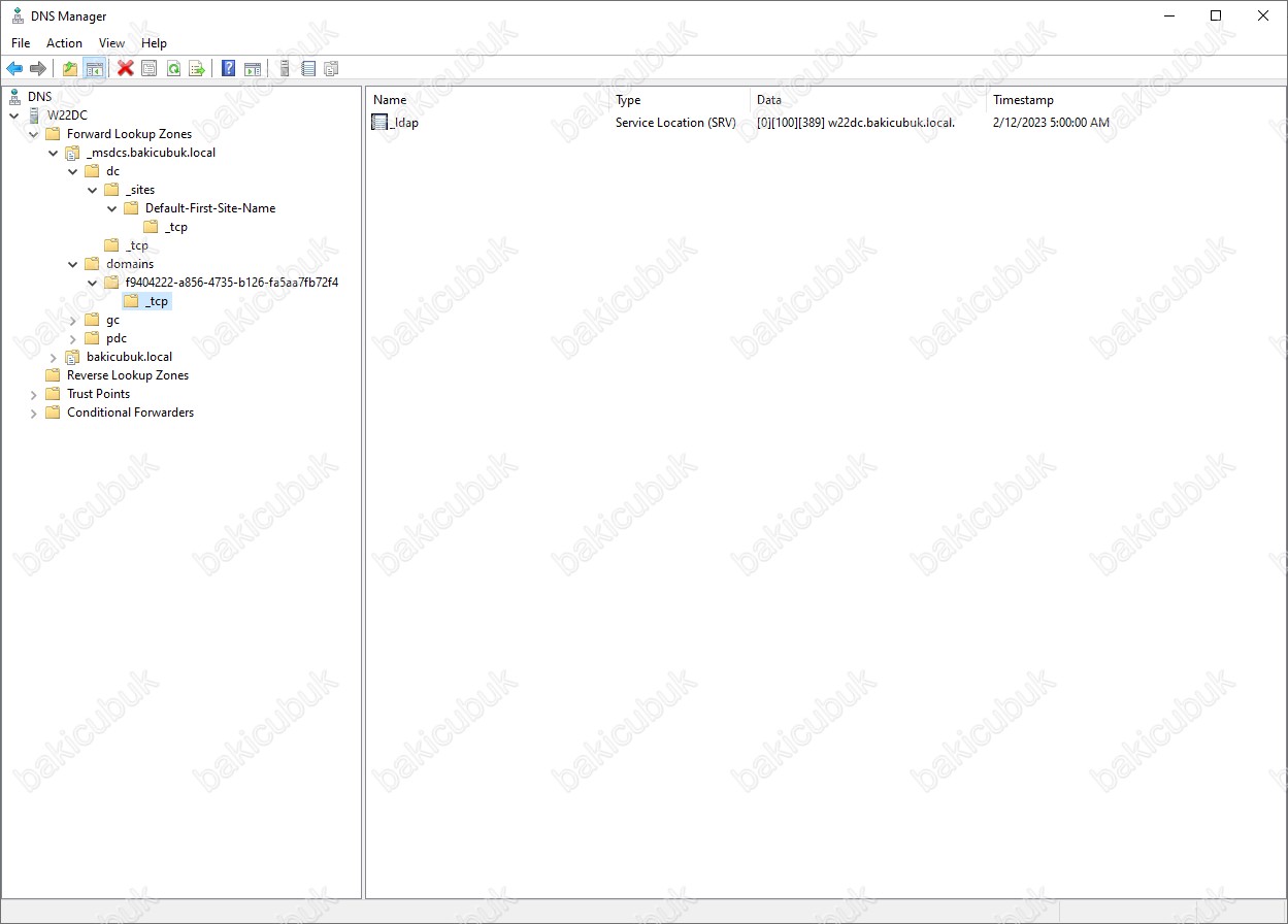 DNS Manager konsolun da Forward Lookup Zones bölümü altında bulunan bakicubuk.local isimli zone bölümü altında _msdcs altında bulunan W22DC isimli Windows Server 2022 işletim sistemine sahip sunucumuzun Name Server (NS) kaydının eklendiğini görüyoruz.