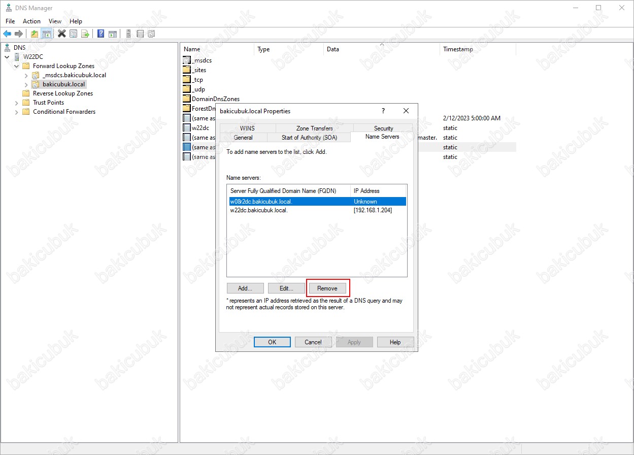 bakicubuk.local Properties ekranın da Name servers bölümü altında bulunan w08r2dc.bakicubuk.local isimli sunucumuzu Remove seçeneğine tıklayarak siliyoruz.