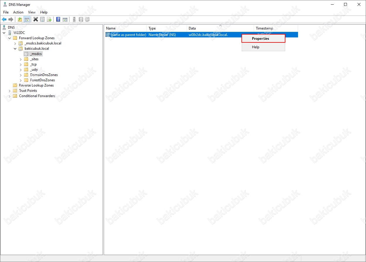 DNS Manager konsolun da Forward Lookup Zones bölümü altında bulunan _msdcs.bakicubuk.local isimli zone bölümü altında bulunan W08R2DC isimli Windows Server 2008 R2 işletim sistemine sahip sunucumuzun Name Server (NS) kaydını silmek için sağ tuş Properties seçeneğine tıklıyoruz.