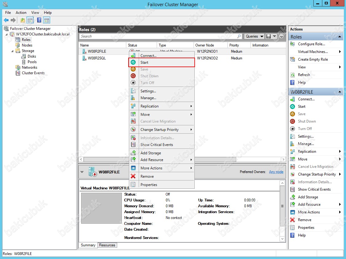 Windows Server 2012 R2 Hyper-V Failover Cluster yapısına taşınan Virtual Machine ( Sanal Makine ) sağ tuş Start diyerek çalıştırıyoruz.