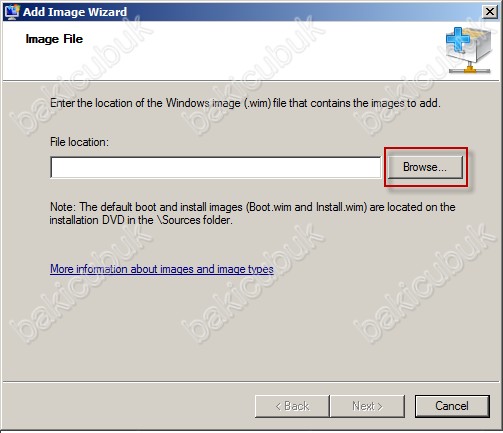 Image File ekraninda Browse tikliyoruz DVD’nizdeki sources klasörünü ve içindeki boot.wim dosyasını gösterin. Unutmayın, boot.wim ya da install.wim i farklı bir yerden de alabilirsiniz. Doğru yolu gösterin yeter.