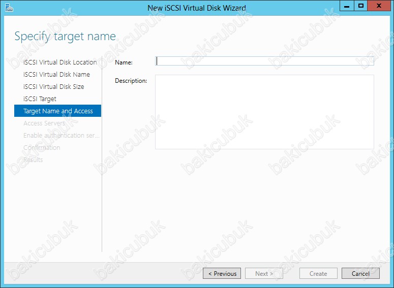 Specify ISCSI virual disk name ekraninda oluşturacağım ISCSI sanal disk için Name kısmında bir isim belirtmemiz gerekiyor.