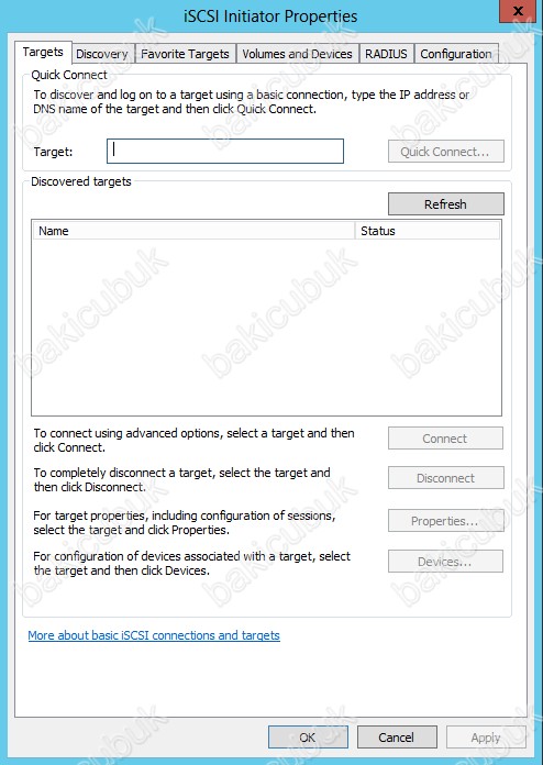 ISCSI Initiator Properties ekrani geliyor karşımıza bu ekranda Target bölümüne ortamdaki ISCSI Target Server sunucumuzun IP Adresini ve ya ismini belirtmemiz gerekiyor.