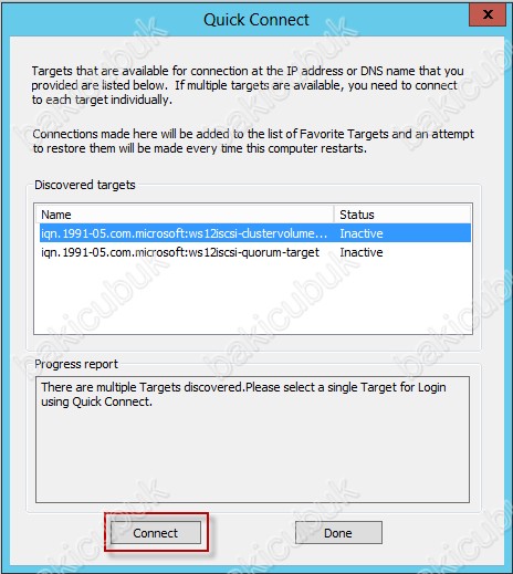 Quick Connect ekraninda görüldüğü gibi ISCSI Target Server üzerinde oluşturmuş olduğum ClusterVolume ve Quorum sanal disklerim görüyorum. Her bir sanal diskim üzerinde sunucuma bağlantisini sağlamak için Connect diyorum.