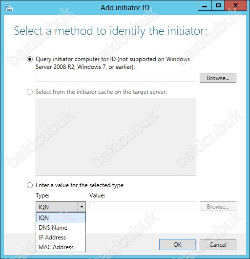 Add initiator ID ekraninda erişimi gerçekleştirecek olan sunucuları belirlememiz gerekiyor. Enter a value for the select type kisminda ISCSI Target Server üzerine bağlantı sağlayacak olan sunucularimiz için kullanabileceğimiz değerleri belirliyoruz. Değer olarak, IQN,DNS Name, IP Adress ve MAC Adress gibi değerleri kullanabiliyoruz.