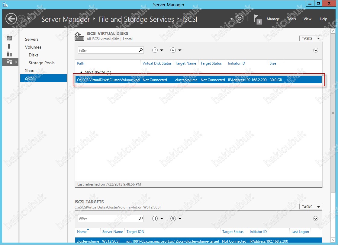 Server Manager konsolunda ISCSI ekranini kontrol ettiğimizde oluşturmuş olduğumuz ClusterVolume ismindeki ISCSI sanal diskimizin oluşturulduğunu görüyoruz.