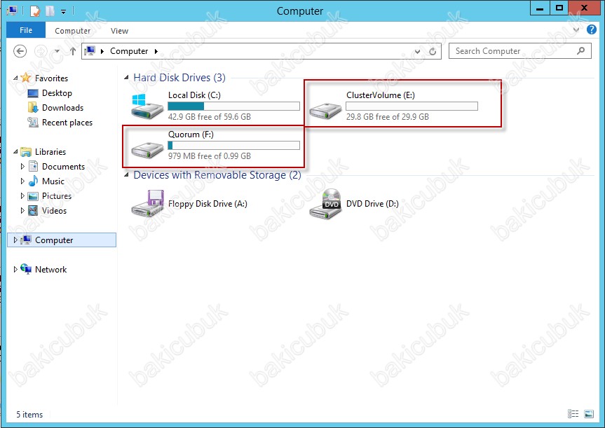 Computer dizini altinda ClusterVolume ve Quorum alanlarinin geldiğini görüyoruz.