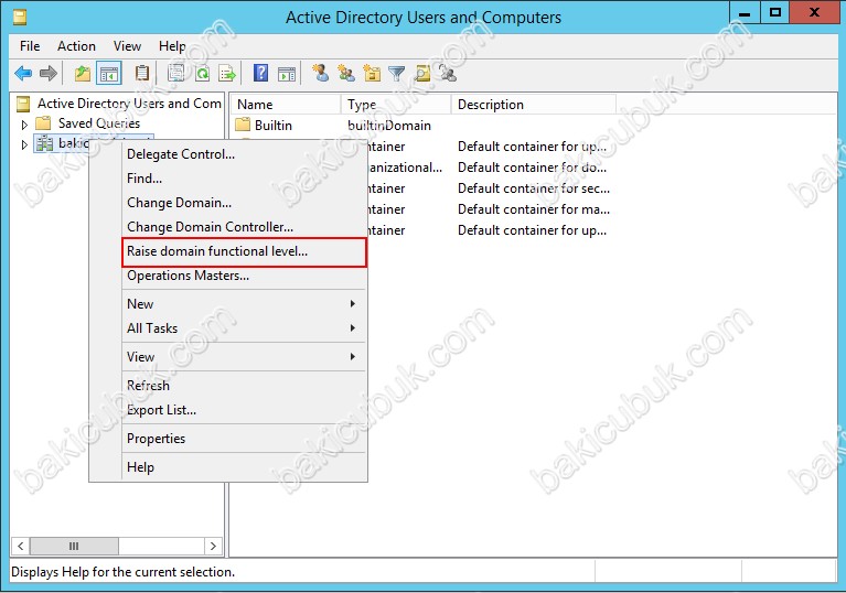 Domain Functional Level için Active Directory Users and Computers konsolunu açıyoruz. Raise domain functional level… seçeneğini seçiyoruz.