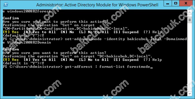 set-addomainmode -identity bakicubuk.local -Domainmode Windows2008R2Domain komutu girdiğimizde Confirm seçeneği gelmektedir. Yes diyerek onaylıyoruz.