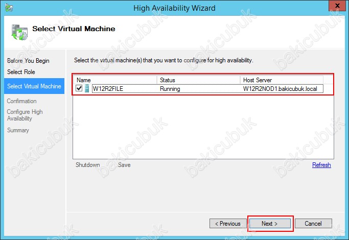 Select Role ekraninda Select the role that you want to configure for high availability bölümünde Virtual Machine seçiyoruz ve Next diyerek devam ediyoruz.